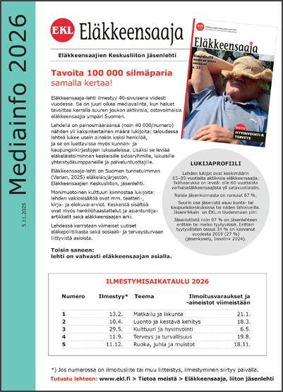 Eläkkeensaaja-lehti ilmestyy kuusi kertaa, keväällä kolme ja syksyllä kolme kertaa (helmi-, huhti-, touko-, syys-, loka- ja joulukuussa). Klikkaa kuvan alta tulostettava 2-sivuinen mediainfo 2025 (mediakortti). Siitä löytyvät ilmoitushinnat.